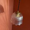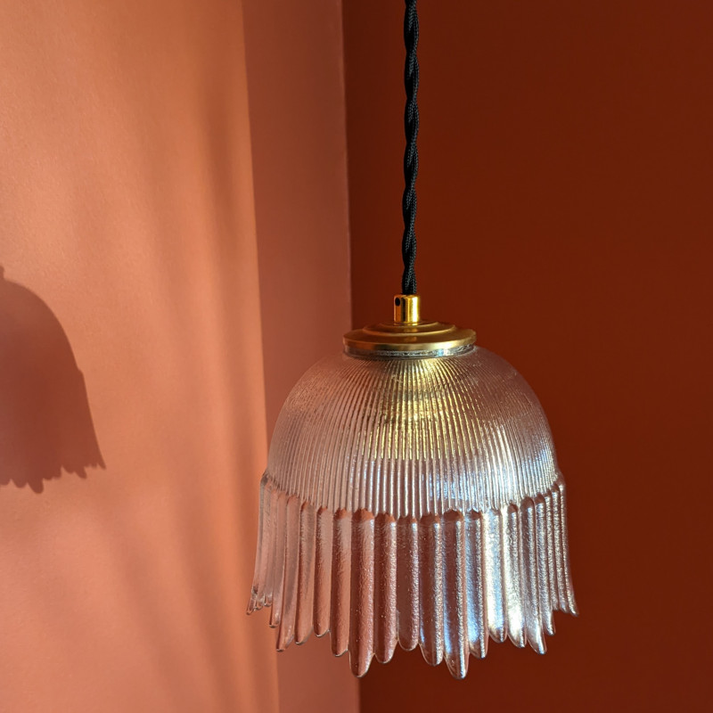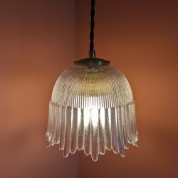 Une suspension en verrerie ancienne holophane ,coiffée de laiton, pour une distribution harmonieuse de la lumière.